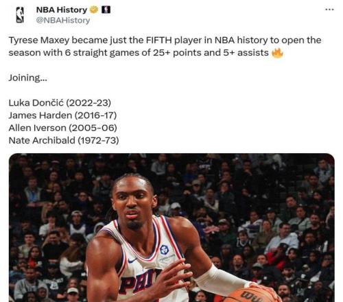其中马克西轻松拿下26+6+7数据,开季前6场连续送出至少25+5助表现,成为NBA历史上第5位交出这一壮举的球员,前四人分别是东契奇(22-23)、哈登(16-17)、艾弗森(05-06)和阿奇博尔德(72-73)。