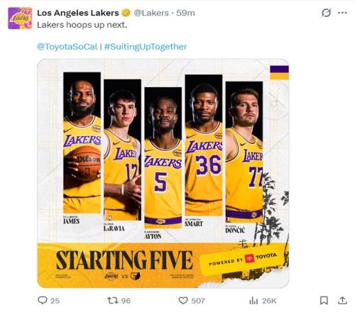 湖人:东契奇、斯玛特、拉拉维亚、詹姆斯、艾顿;